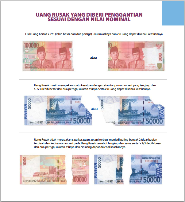 Uang kertas yang akan ditukar harus dalam kondisi yang masih bisa dibaca dan dikenali. Jika uang rusak terlalu parah, seperti sobek hingga separuh atau terkena air, maka kemungkinan besar tidak akan diterima. -